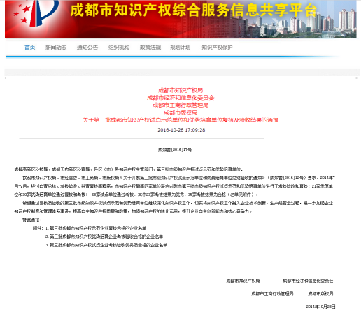 成都普思生物科技股份有限公司自2014年成為成都市知識產(chǎn)權(quán)試點(diǎn)企業(yè)以來,公司不斷進(jìn)取、日益壯大,努力實(shí)現(xiàn)產(chǎn)、學(xué)、研結(jié)合,提高了自主知識產(chǎn)權(quán)的數(shù)量和質(zhì)量,加快了知識產(chǎn)權(quán)的運(yùn)用轉(zhuǎn)化,在知識產(chǎn)權(quán)工作制度的完善、知識產(chǎn)權(quán)工作人才隊(duì)伍的壯大、專利的申請、轉(zhuǎn)化實(shí)施和相關(guān)產(chǎn)品銷售等方面都取得了豐碩的成果。在2016年10月成都市知識產(chǎn)權(quán)局組織的復(fù)核及驗(yàn)收工作中,成功通過驗(yàn)收,驗(yàn)收考核結(jié)果為“優(yōu)秀”。