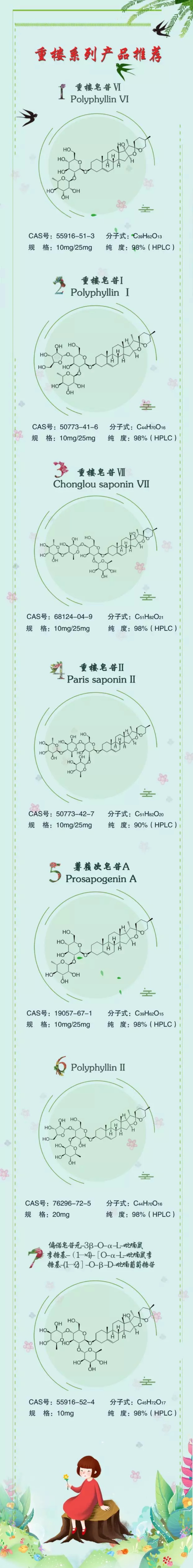 重樓皂苷Ⅵ、重樓皂苷I、重樓皂苷Ⅶ、重樓皂苷II、薯蕷次皂苷A、Polyphyllin II、偏諾皂苷元-3β-O-α-L-吡喃鼠李糖基-(1→ 4 )-[O-α-L-吡喃鼠李糖基-( 1→2) ]-O-β-D-吡喃葡萄糖苷,產(chǎn)品信息如下: