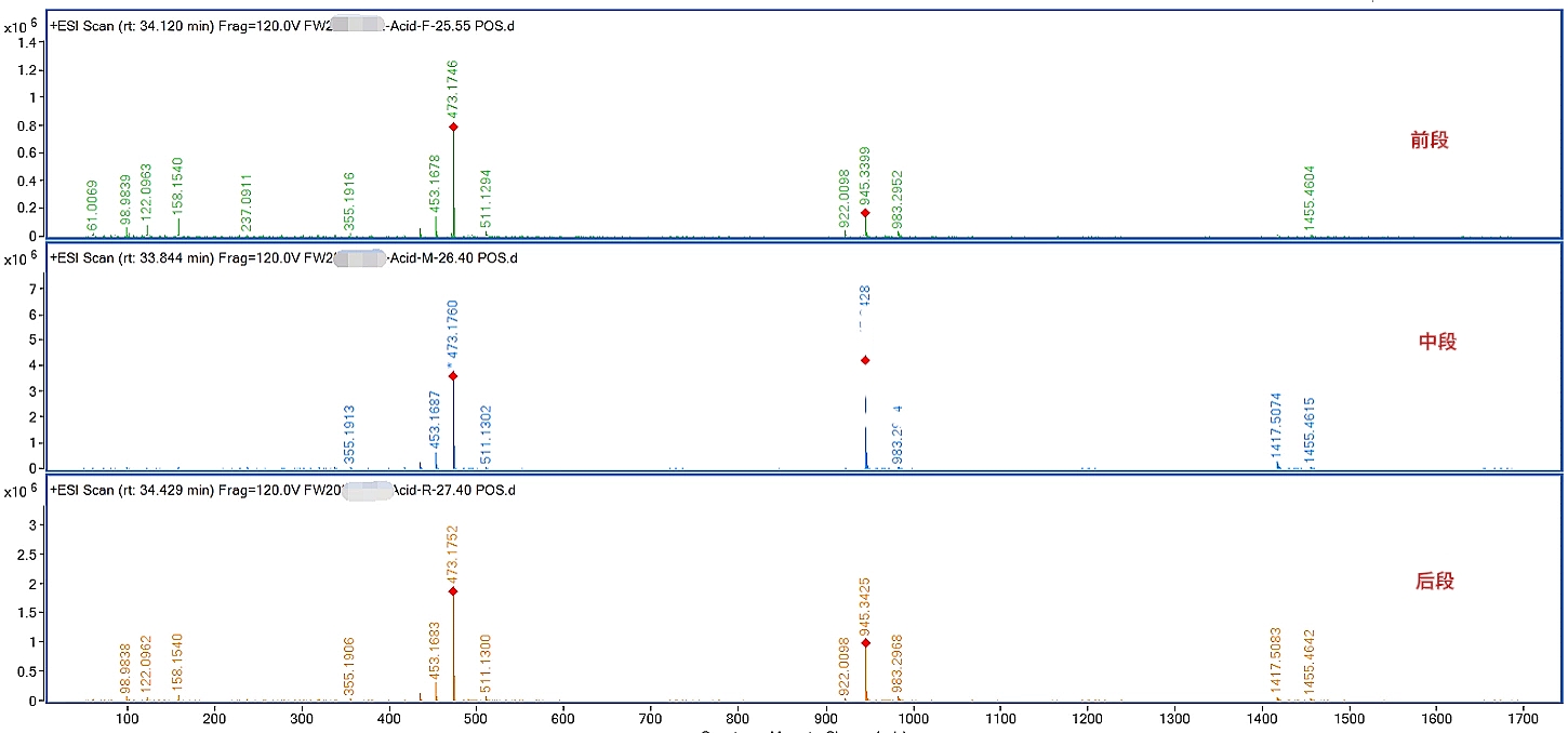 圖2 主峰前、中、后三段一級質(zhì)譜圖比較