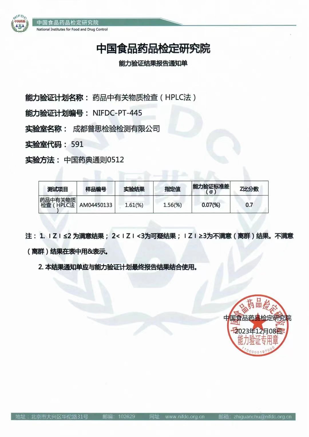 成都普思順利通過(guò)中檢院藥品中有關(guān)物質(zhì)檢查(HPLC法)能力驗(yàn)證